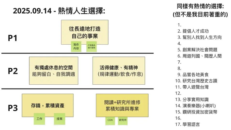 當你感到焦慮時,告訴自己:「我沒有放棄它們,我只是在排隊。」這能有效降低害怕錯過的焦慮,讓你的熱情有聚焦的出口。