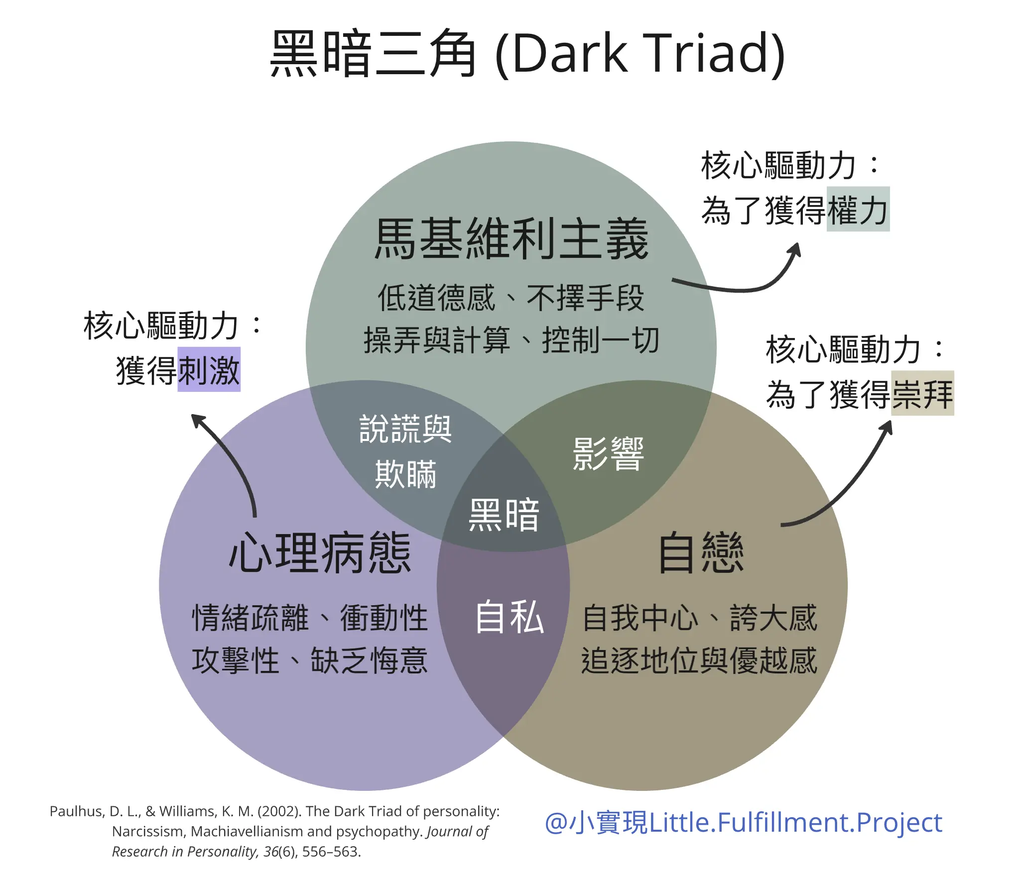 「黑暗三角」這一概念由心理學家 Paulhus 和 Williams 於 2002 年提出,指的是三種在一般人群中雖然顯著、但未達到臨床病態程度的人格特質。